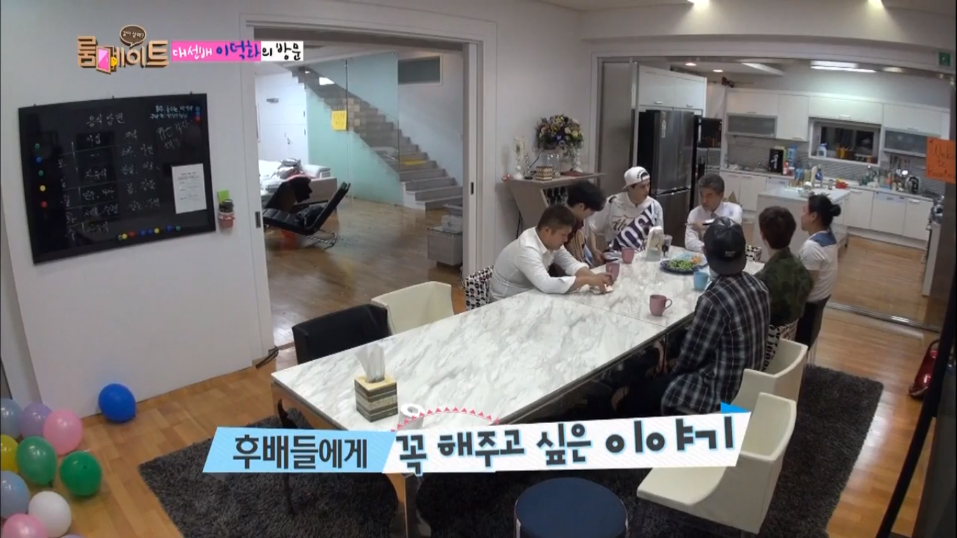 Dong Wook, Soo Hyun, and Deok Hwa are in the living room talking while the others are in the kitchen. Bom joins them after being startled by Dong Wook. Deok Hwa takes a selfie with Bom and Soo Hyun. Bom is going to send the picture to her manager, who is a fan of Deok Hwa. Deok Hwa says he knows her CEO and asks if she is from SM. Taken aback, Bom corrects him, saying she is from YG. Deok Hwa plays it cool and says they'll probably end up friends. Nana and the rest gather in the living room before dinner. Se Ho took it upon himself to prepare a brief history of Deok Hwa. He reports a list of important dates and program names which Deok Hwa participated in. Dong Wook asks if Deok Hwa bought a house warming gift. Deok Hwa explains he asked others what to buy until his friend told him he needed to bring an envelope. He reaches into his jacket pocket and presents to the roommates an envelope (of money). Everyone is gracious for the generous gift.